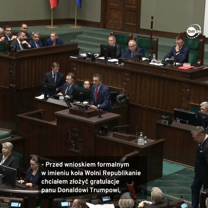 Jarosław Sachajko van de Vrije Republikeinen kring [voorheen Kukiz 15]feliciteerde Donald Trump vanaf het parlementaire podium toen hij de 47ste president van de VS werd, volgens peilingen. Na deze woorden stonden parlementsleden van Wet en Rechtvaardigheid en de Confederatie op van hun zetels en begonnen te klappen en scandeerden: "Donald Trump".