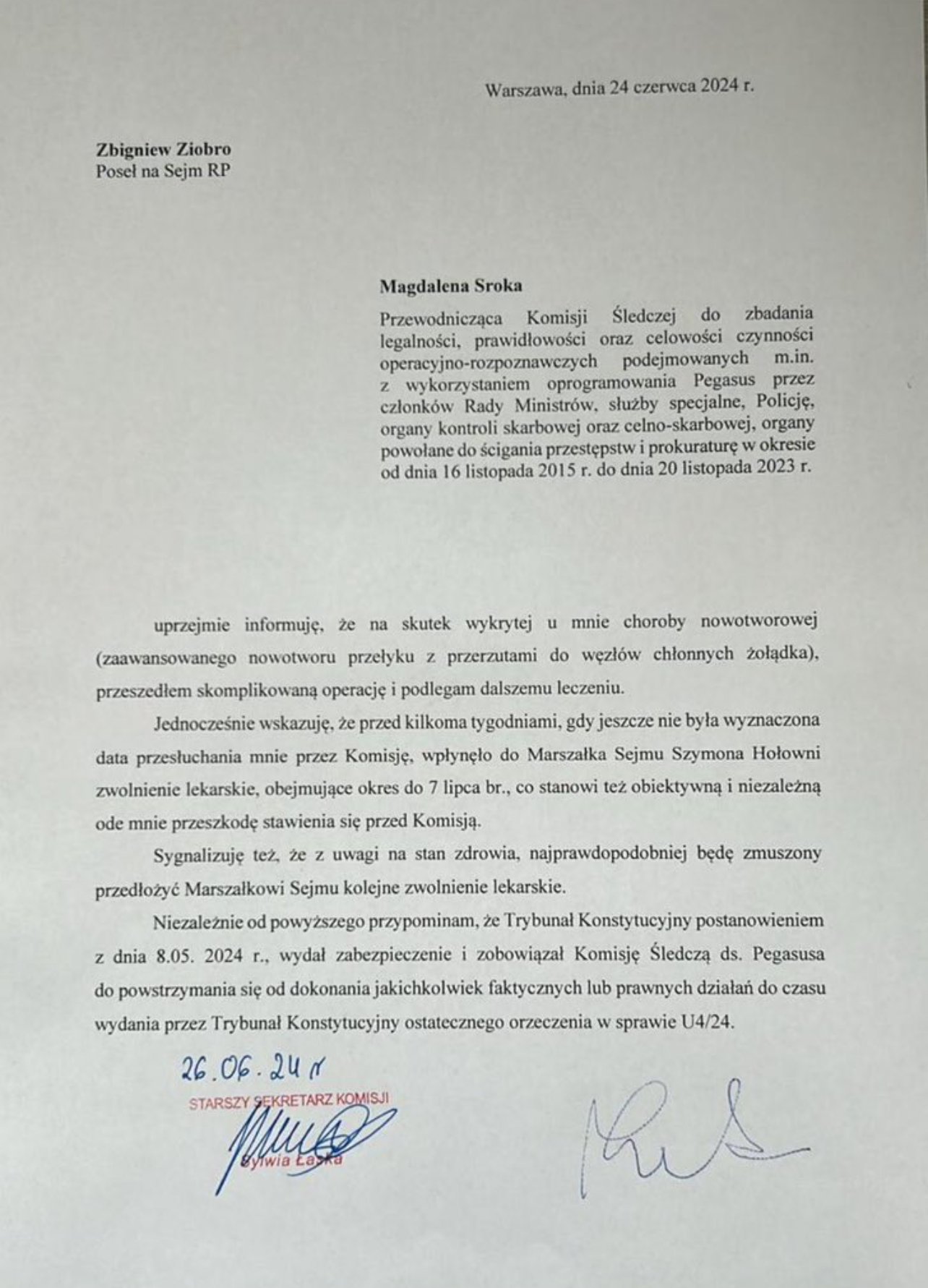 Tegelijkertijd wil ik erop wijzen dat ik enkele weken geleden, toen de datum van mijn hoorzitting voor de Commissie nog niet was vastgesteld, van de voorzitter van de Sejm, Szymon Holownia, ziekteverlof heb gekregen voor de periode tot 7 juli van dit jaar, wat ook een objectieve belemmering vormt, onafhankelijk van mij, voor mijn verschijning voor de Commissie.