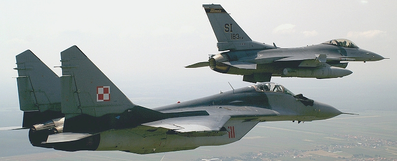 Een Poolse MiG-29 met een USAF F-16 – auteur U.S. Air Force photo by Tech. Sgt. Shaun Kerr